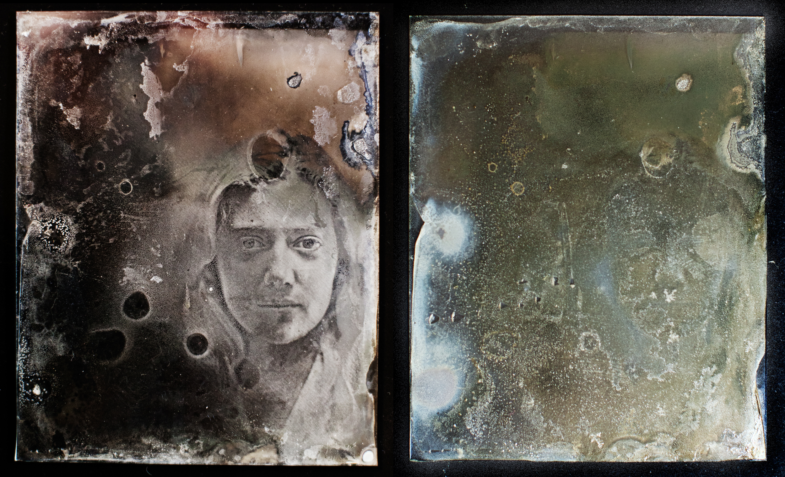 So I have created several plates and much to my horror and dismay have realised I didn’t leave some of them in the fixer for long enough. There is a positive side to this, I was able to watch the deterioration of one image which was very interesting. The downside of course, I lost a beautiful image. I documented the loss of the image and the chemicals eating into the sitters face. It was as ephemeral in the end, as a passing reflection in a train window. Such is life.